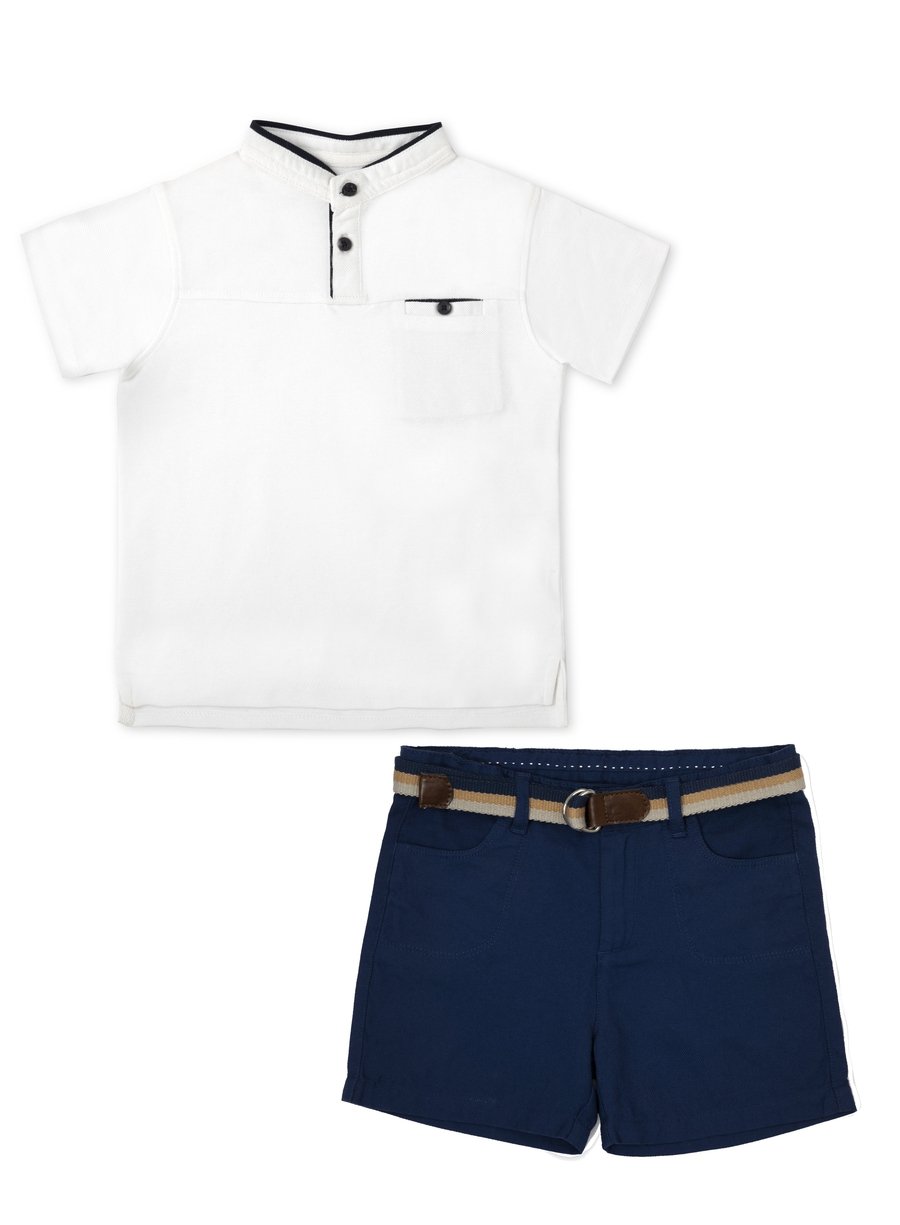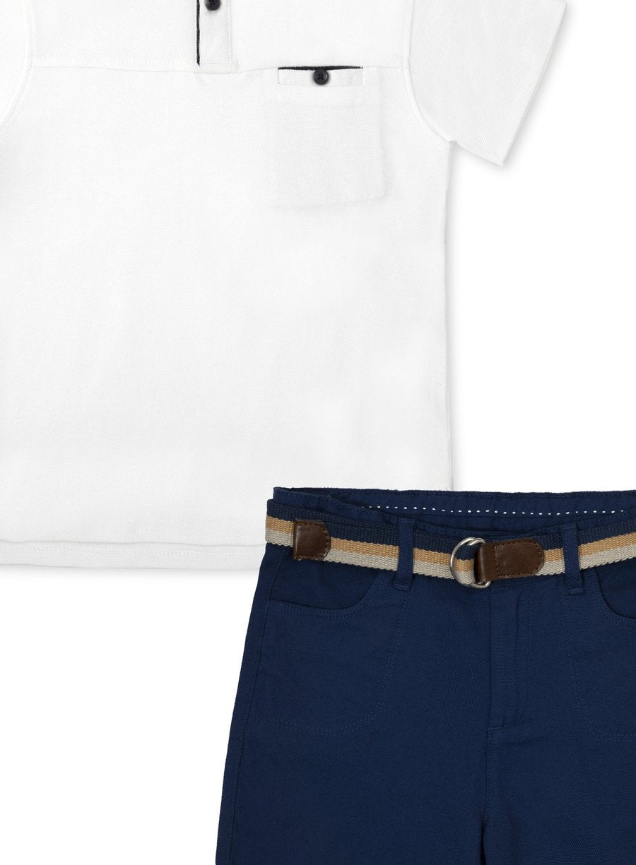 Let your kids have fun with fashion in this stylish white & blue combo that includes our Pique Polo T-shirt & deep blue Oxford shorts with an adjustable belt, both designed from soft & breathable 100% GOTS-certified Organic Cotton.