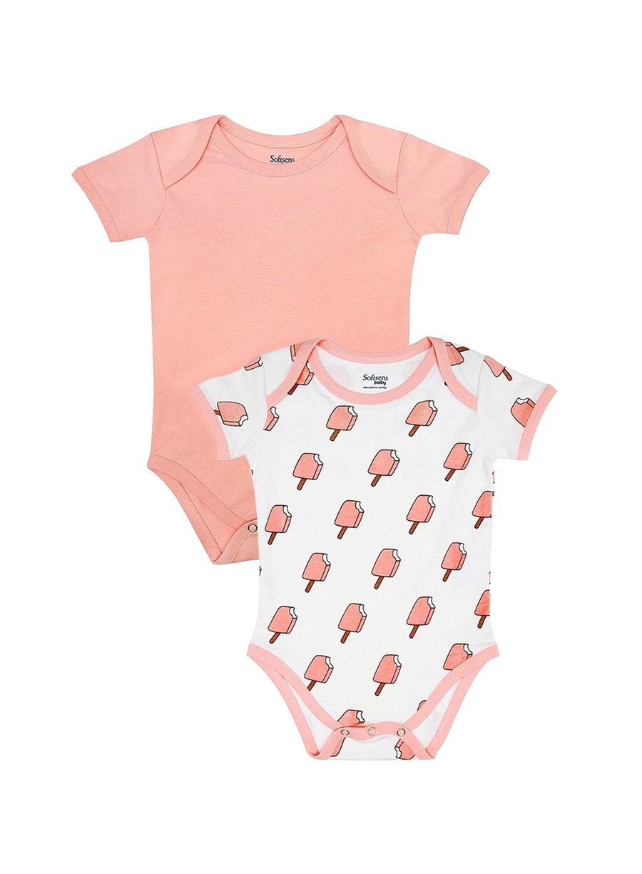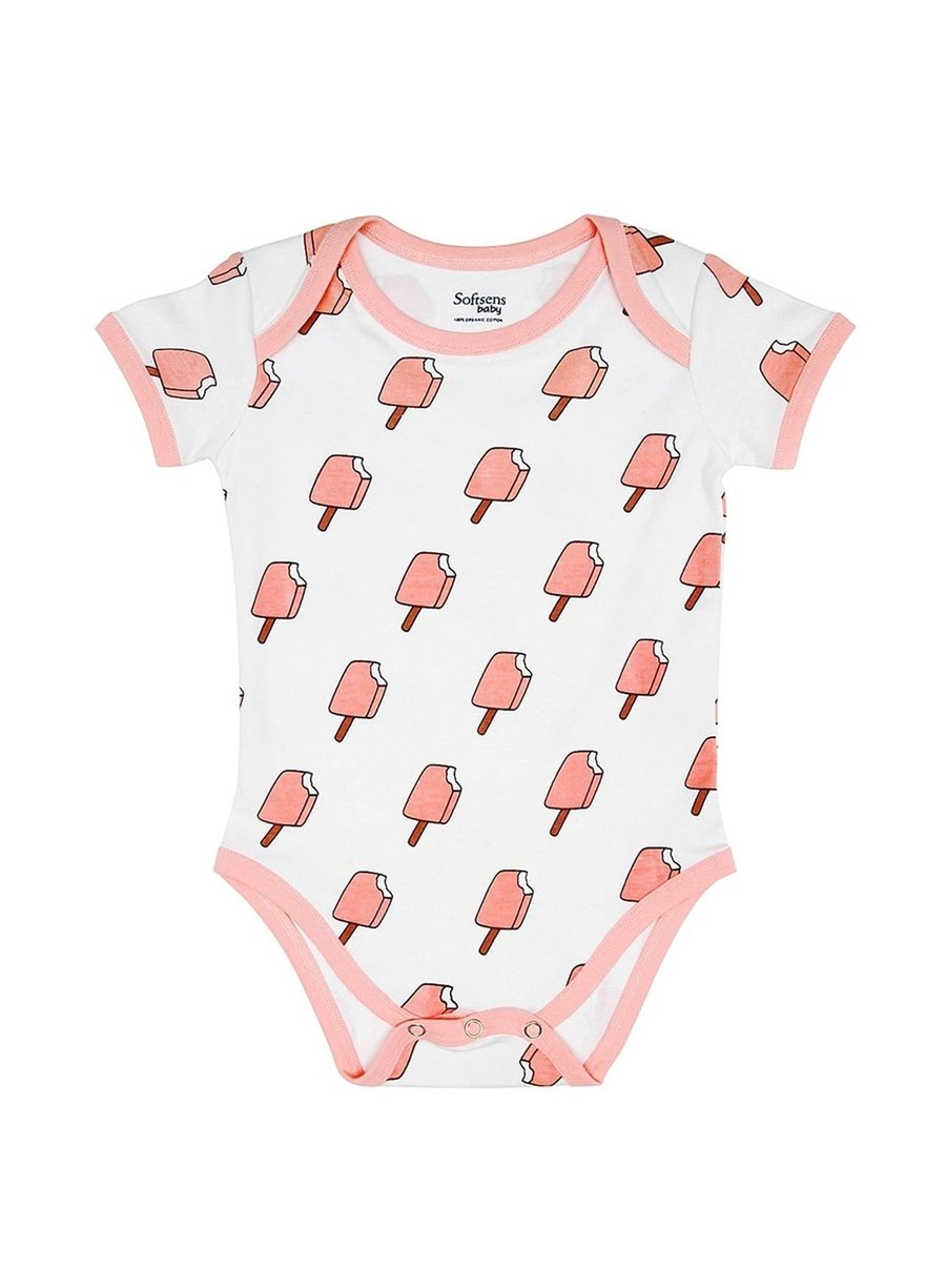 This Stylish and comfortable collection of newborn baby girl bodysuits are made from 100% GOTS certified organic cotton. The ultra-soft, super comfortable double-knit jersey fabric, is easily stretchable and allows playful movements for maximum comfort and has easy-fold shoulders and snap closures for quick and efficient diaper changes. This Two-piece set, contains a perfectly pink colored bodysuit, and a white bodysuit with all over ice-cream print. Who doesn't love ice-cream?
