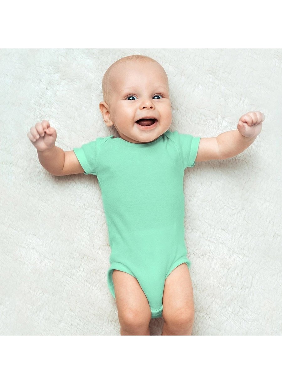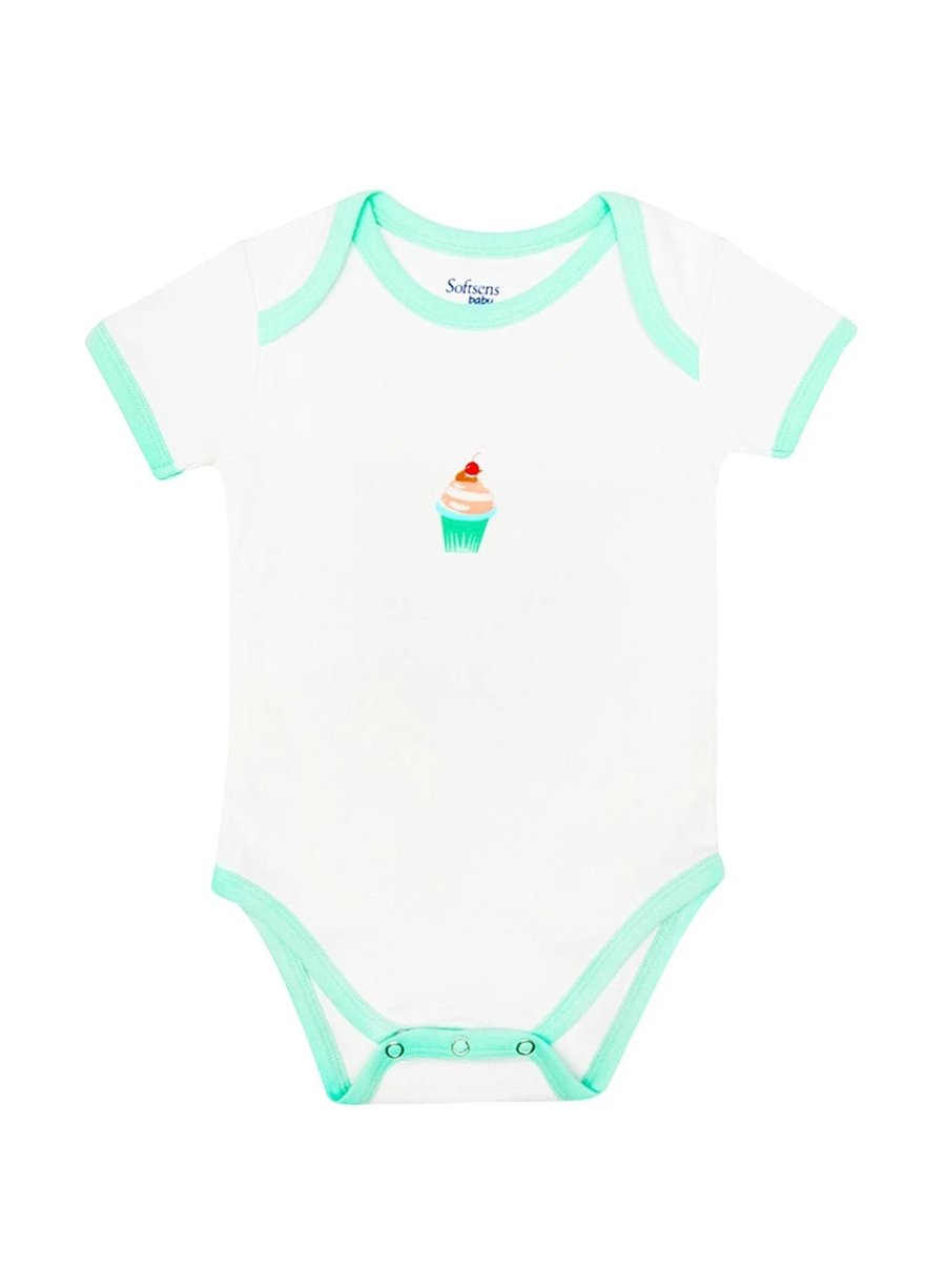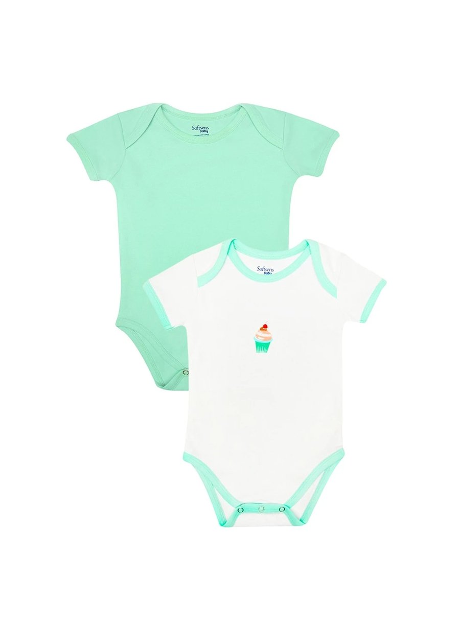 This Stylish and comfortable collection of newborn unisex bodysuits are made from 100% GOTS certified organic cotton. The ultra-soft, super comfortable double-knit jersey fabric, is easily stretchable and allows playful movements for maximum comfort and has easy-fold shoulders and snap closures for quick and efficient diaper changes. This Two-piece set, contains a mint green colored bodysuit, and a white bodysuit with mint piping and a cupcake chest print.